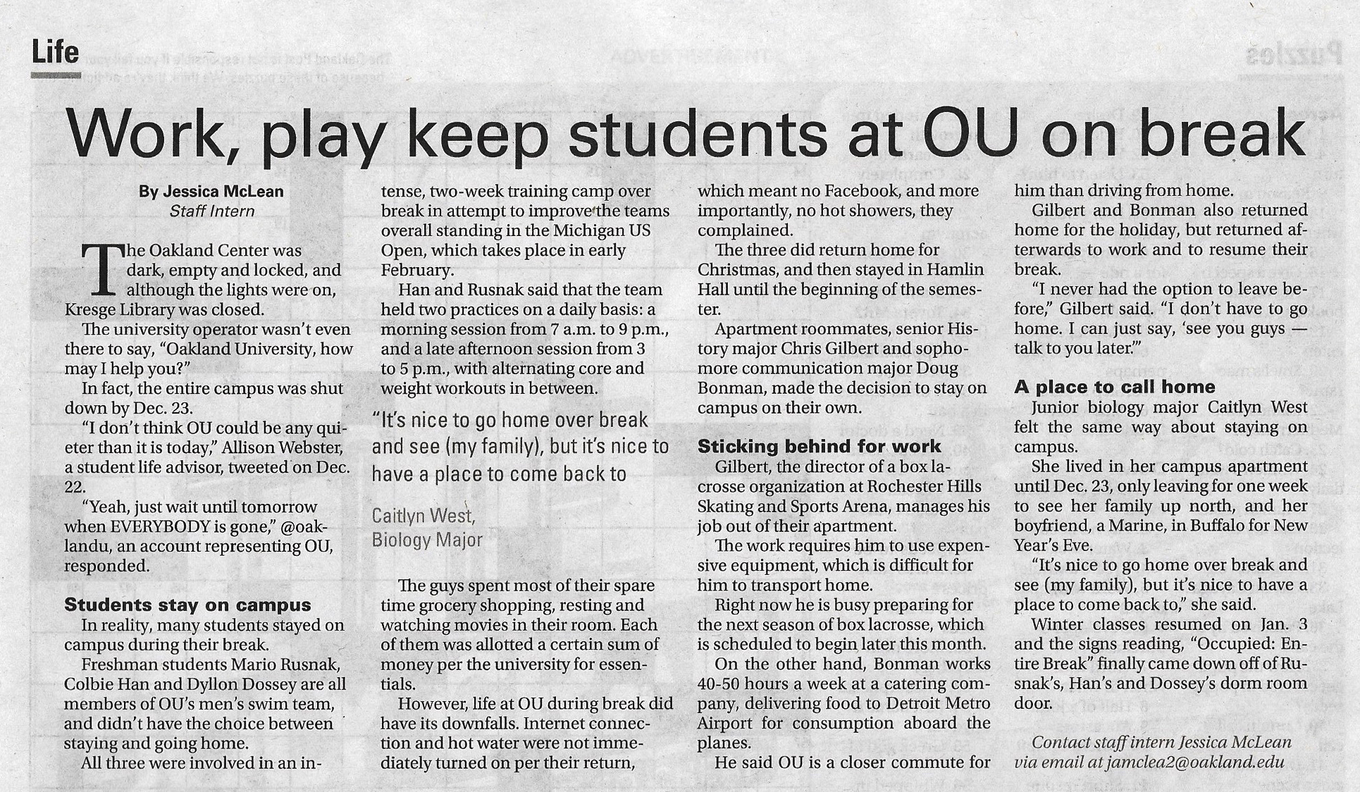 This story is the first one I ever wrote for the Post as a staff reporter intern. It appeared in the Post in the Life section on January 3, 2012. An online version of this story is also published at: http://www.oaklandpostonline.com/life/article_0df95bc4-4d8d-5c78-b595-e1e5b6145ac2.html.