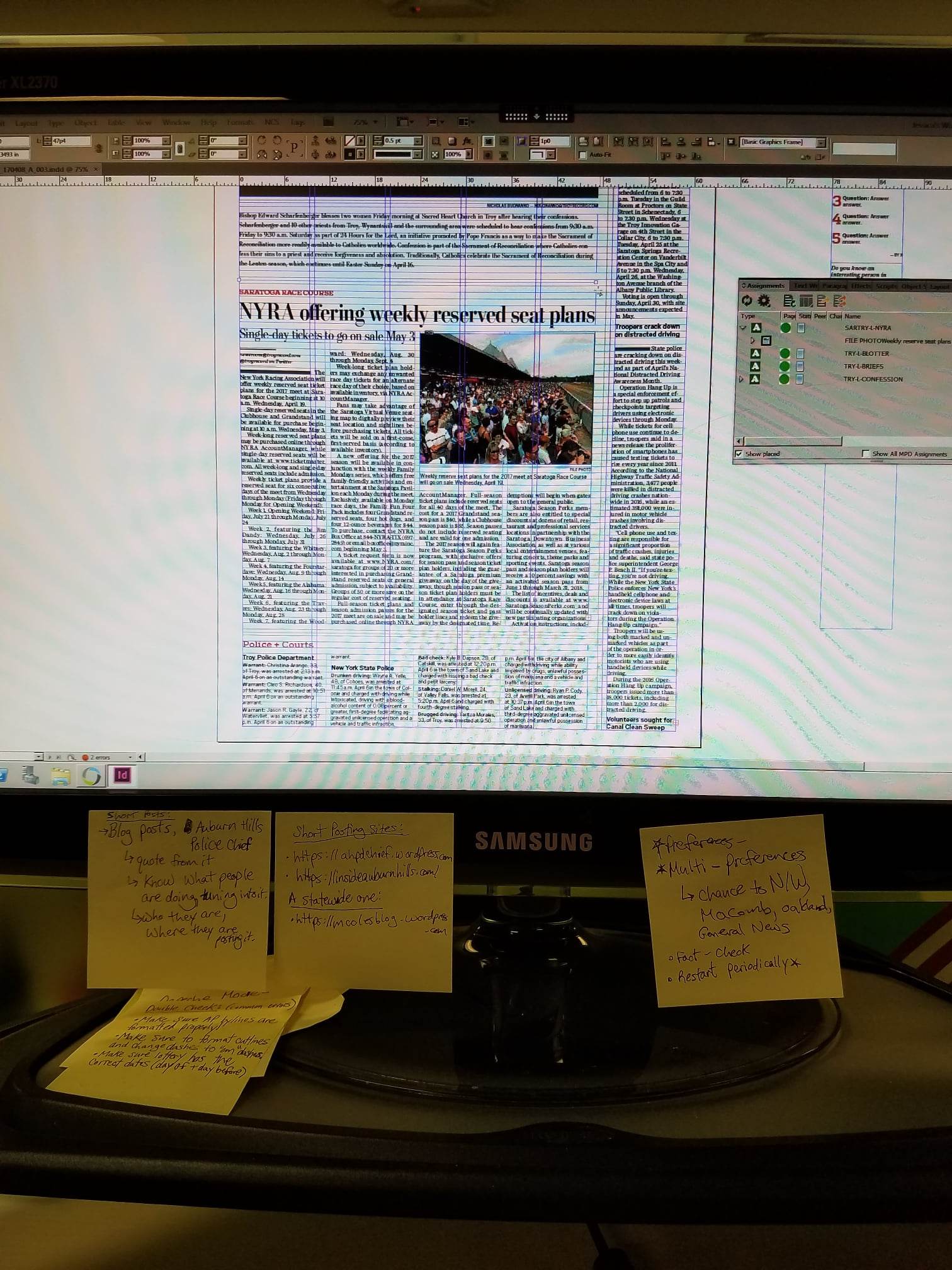 Michigan content functions differently than New York content. Whereas New York content tends to be mostly pre-prepared and very rigid in what editors desire in design, Michigan content is not always pre-packaged and requires more creativity and effort on the part of the paginator. For instance, skyboxes and rails are linked to the page for New York, whereas the paginator designs them for Michigan. These pages, thus, gave me more freedom to showcase my design skills and to work with editors right here in Michigan. This includes attending Oakland Press meetings, where I interacted with editors, presented daily wire budgets and chose the front-page template for the day.