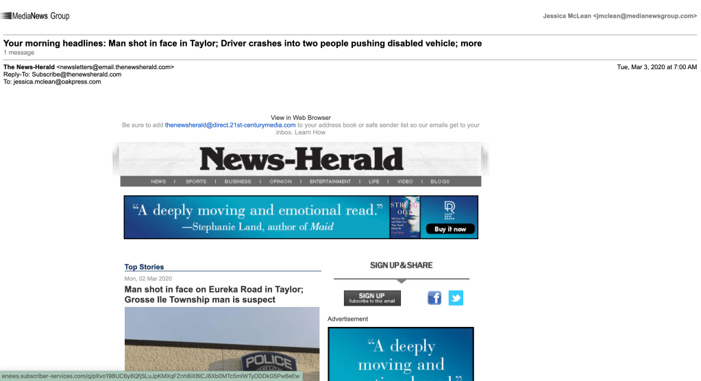 Here’s a look at the News Herald website while I was managing it. You can see that a reporter has used a file photo I took of the Taylor Police Department for their story about a man who was shot on Eureka Road. I subsequently used the story in a newsletter, which I have sent to myself to test before I send it out.